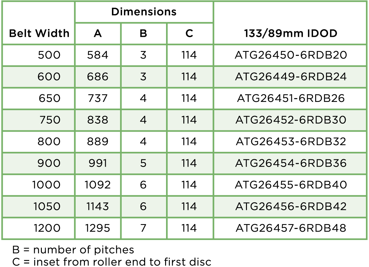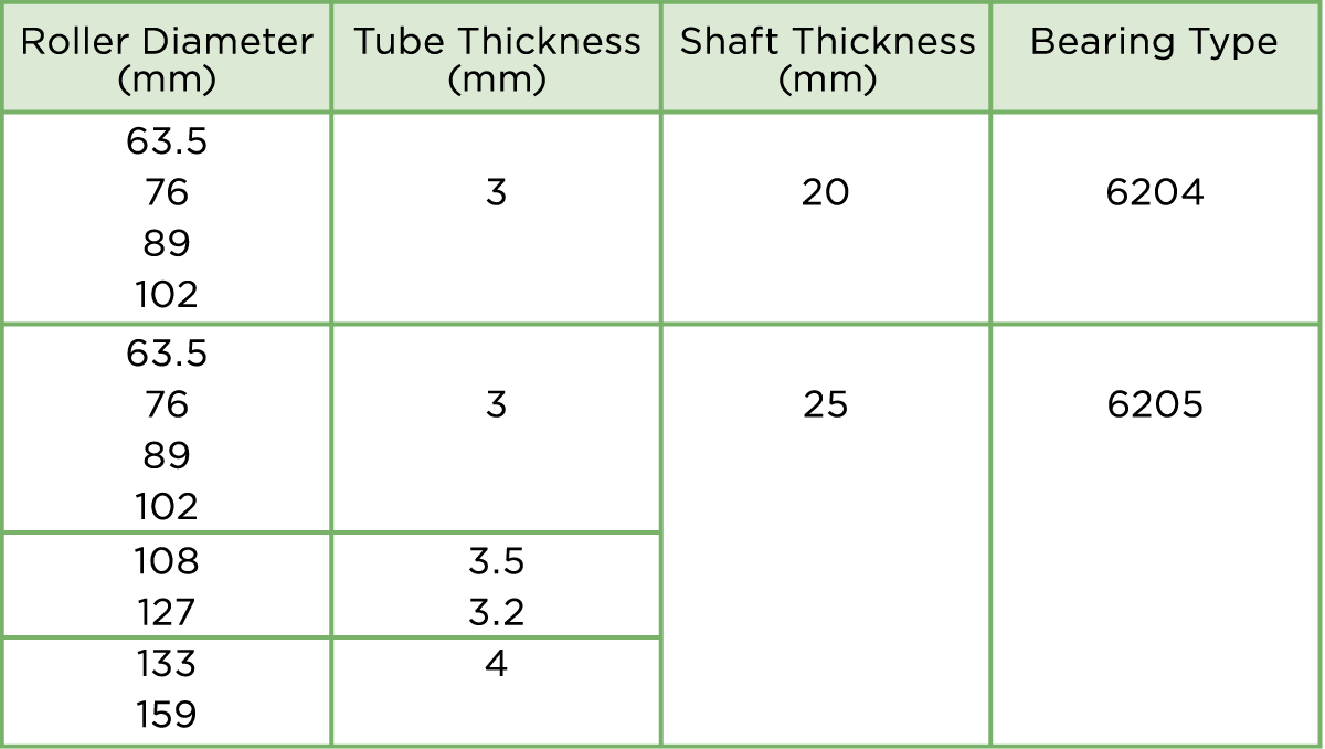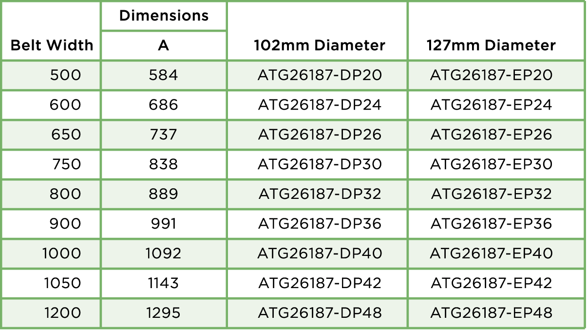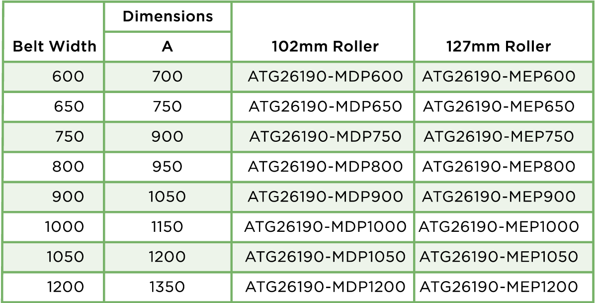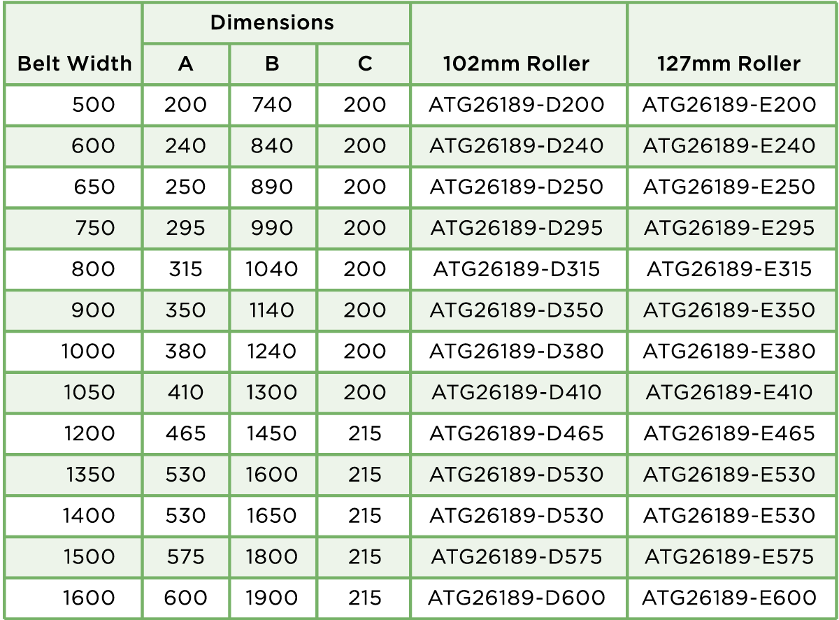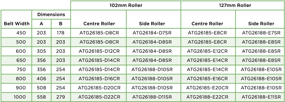 With continued quality inspections carried out throughout production all roller bearings have a minimum 40,000 working hour warranty. The table below showcases our standard size rollers. Bespoke options are also available upon request with a variety of different diameters and tube thicknesses. ![]() ADJUSTABLE TROUGH SETS AND RETURN ROLLERS ATG Conveyor Components supply a wide range of adjustable trough sets and return rollers for a variety of applications for the mining, material processing, waste recycling and crushing & screening industries. Below follows a selection of these items with technical and dimensional detail on each. VARI ANGLE – 3 ROLL TRANSOM Designed for light to medium applications our Vari Angle Sets feature an adjustable roller which allows the wing idler to be set at 20°, 30°, 40°, 50° and 60°. This low rolling resistance design is compatible with one of the most universally used systems on the market and is available with 102mm and 127mm diameter rollers. Rollers can be manufactured with either 20mm or 25mm bearings as standard. All transom frames can be supplied either painted black, galvanised or self-colour to suit customers’ requirements. ![]() ![]() VARI ANGLE – RETURN ROLLERS ATG Conveyor Components offer a wide range of Vari Angle Return Rollers ranging from 63.5mm up to 168mm diameter to suit customers’ individual requirements and applications. We can cater for all belt widths. ![]() ![]() VARI ANGLE – DISC RETURN ROLLERS Disc Return Rollers are mainly used on conveyor systems where wet or sticky materials can build up on standard return rollers. The ring design minimise detritus collecting on the roller prolonging product life and increasing system efficiency. ![]() ![]() FIXED – 3 ROLL TROUGHING ROLLER SET Designed to be used in more heavy-duty applications than the adjustable sets these 3 Roll Troughing Sets have a fixed angle. ATG Conveyor Components can cater for all roller diameters and belt widths to suit customers’ individual requirements and applications. All transom frames can be supplied either painted black, galvanised or self- colour as per customers’ specifications. ![]() ![]() FIXED RETURN ROLLER For use in conjunction with the Fixed Troughing Sets these heavy-duty Fixed Return Rollers come in 102mm & 127mm diameters. Rollers are supplied with a powder coated finish. ![]() ![]() SUSPENDED SETS Designed for ease of installation our range of Suspended Sets are used primarily in field conveyor systems. With excellent low rolling resistance, good lateral and ground clearance this versatile design is supplied with 102mm or 127mm rollers and is compatible with belt widths of 600mm to 900mm. ![]() ![]() Whether you’re looking for bespoke parts or a large volume of identical product ATG Conveyor Components will work with you to feed into your installation timetables. We can also work to your scheduled maintenance programmes to ensure downtime is kept to an absolute minimum of any plant or conveying systems. For more information please get in touch with Global Project Manager, Tony Hooker, or Business Development Manager, Gillian Miller. You can also get in touch by filling out our Contact Form or giving us a call on +44 (0) 330 041 7076. |